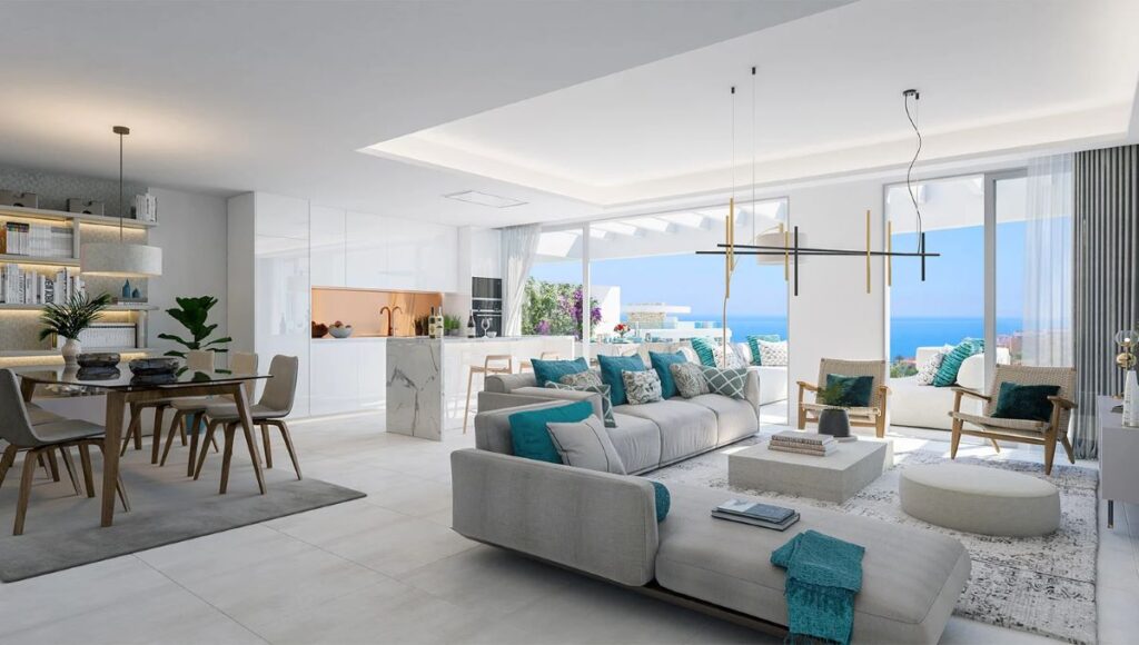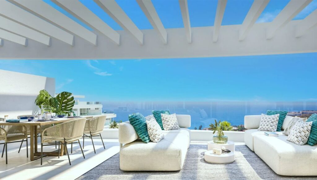 Moderne lejlighed med tre soveværelser og tre badeværelser med storslået havudsigt til Middelhavet, beliggende i La Cala de Mijas. Med 107 m² indendørs areal og to pergolaterrasser på i alt 30 m² er den lys, indbydende og designet til komfort og afslapning på Costa del Sol.